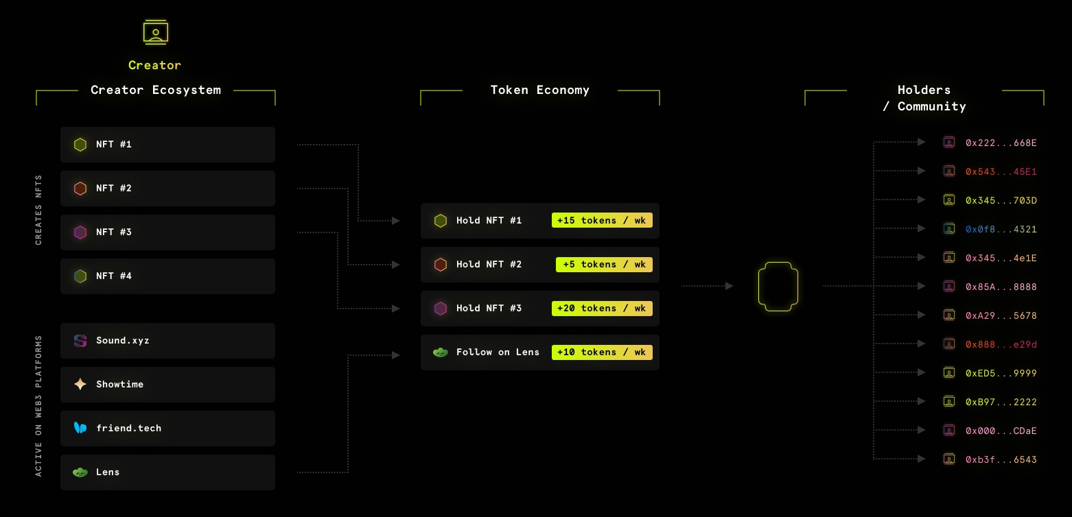 Creators can create NFTs that Holders will buy, mint, and hold. Create POAPs every time they organize events. Be active on a number of web3 protocols and apps such as Zora, Sound, Audius, or Lens. All these “engagements” form what we call a Creator’s economy. This economy is represented by a Token within the P00LS protocol.