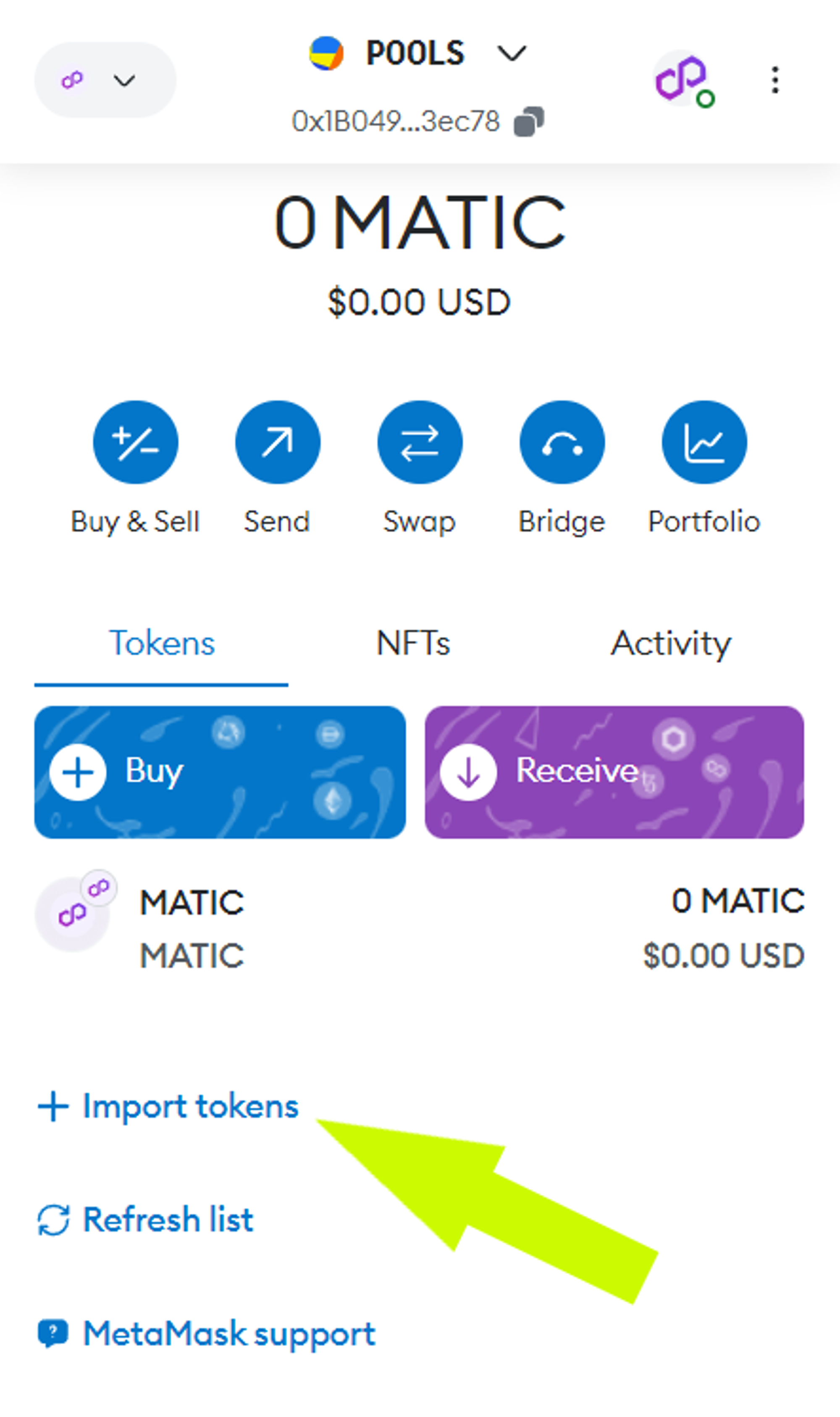 If you are using a MetaMask wallet, scroll down and look for the **`Import tokens`** option.