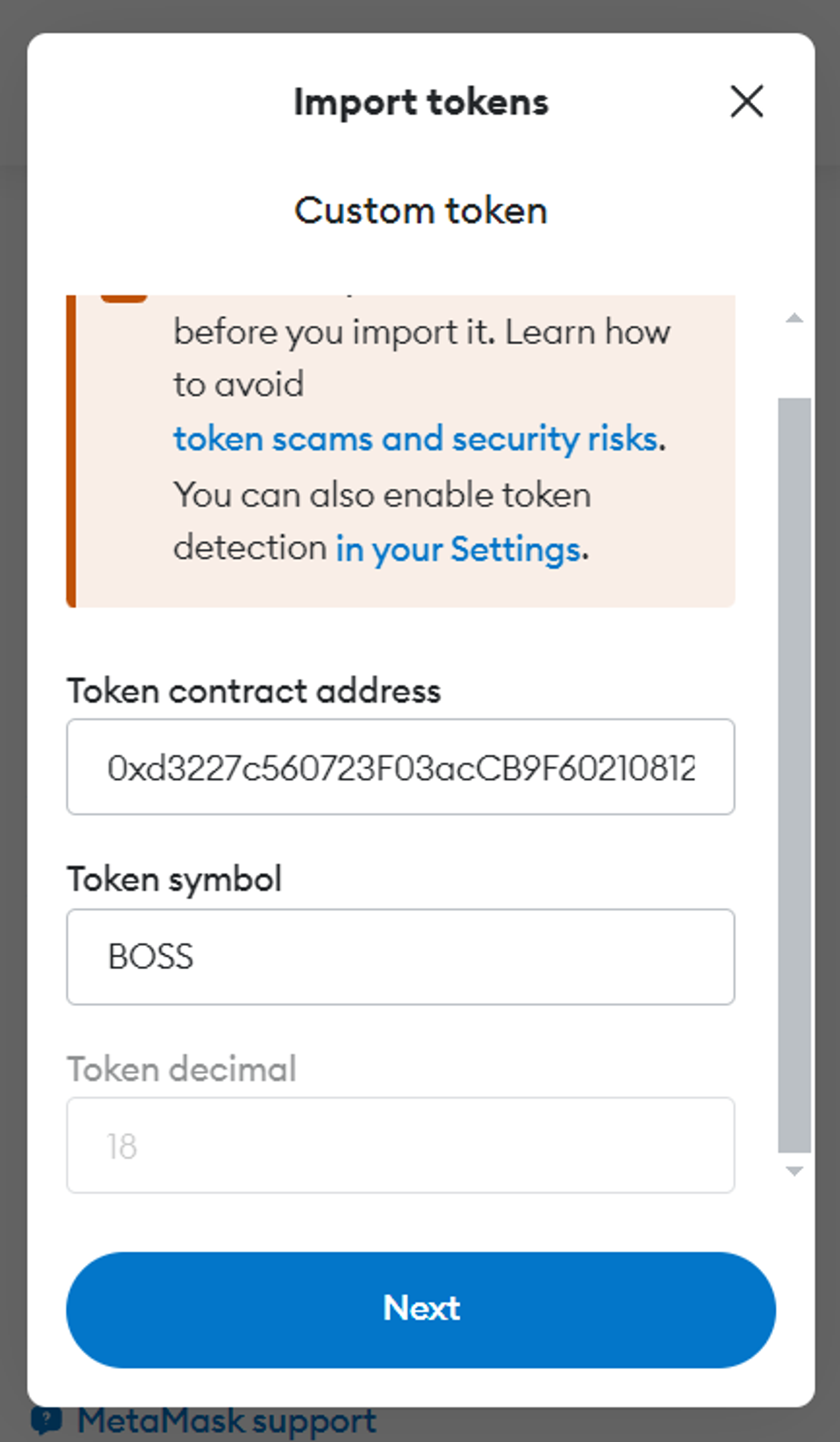 Add the contract address that you copied in **Step 3**. The **`Token symbol`** and **`Token decimal`** should populate automatically. Click on **`Next`** , then click on **`Import`** .