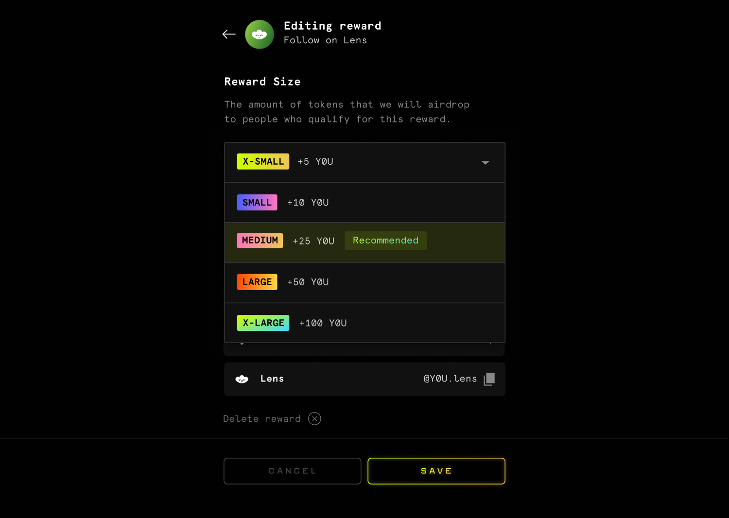 You have the option to edit the reward size based on the built-in [T-Shirt Reward System](https://p00ls.gitbook.io/p00ls-v2/token-distribution/token-rewards/reward-sizes).