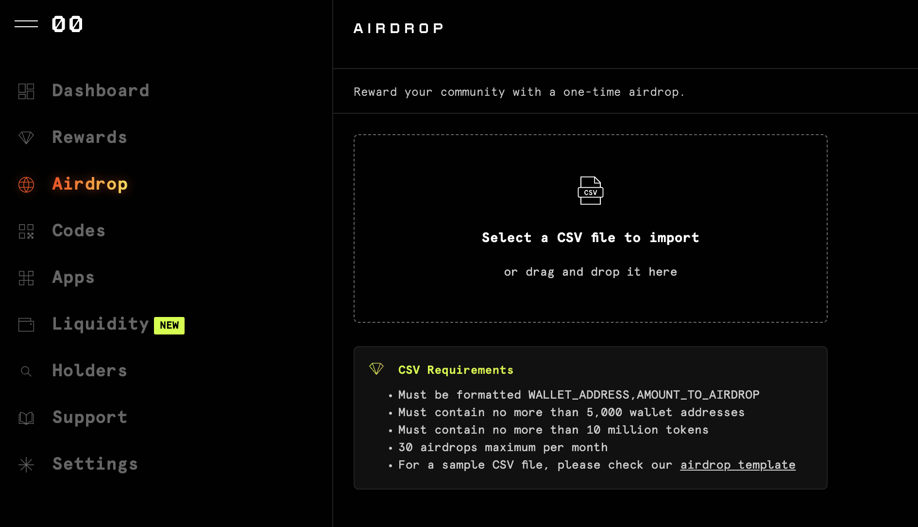 Navigate to the **Airdrop** page in the Creator Portal. Download the **airdrop template**. This template ensures that our protocol can process your airdrop and distribute your token to your intended audience.