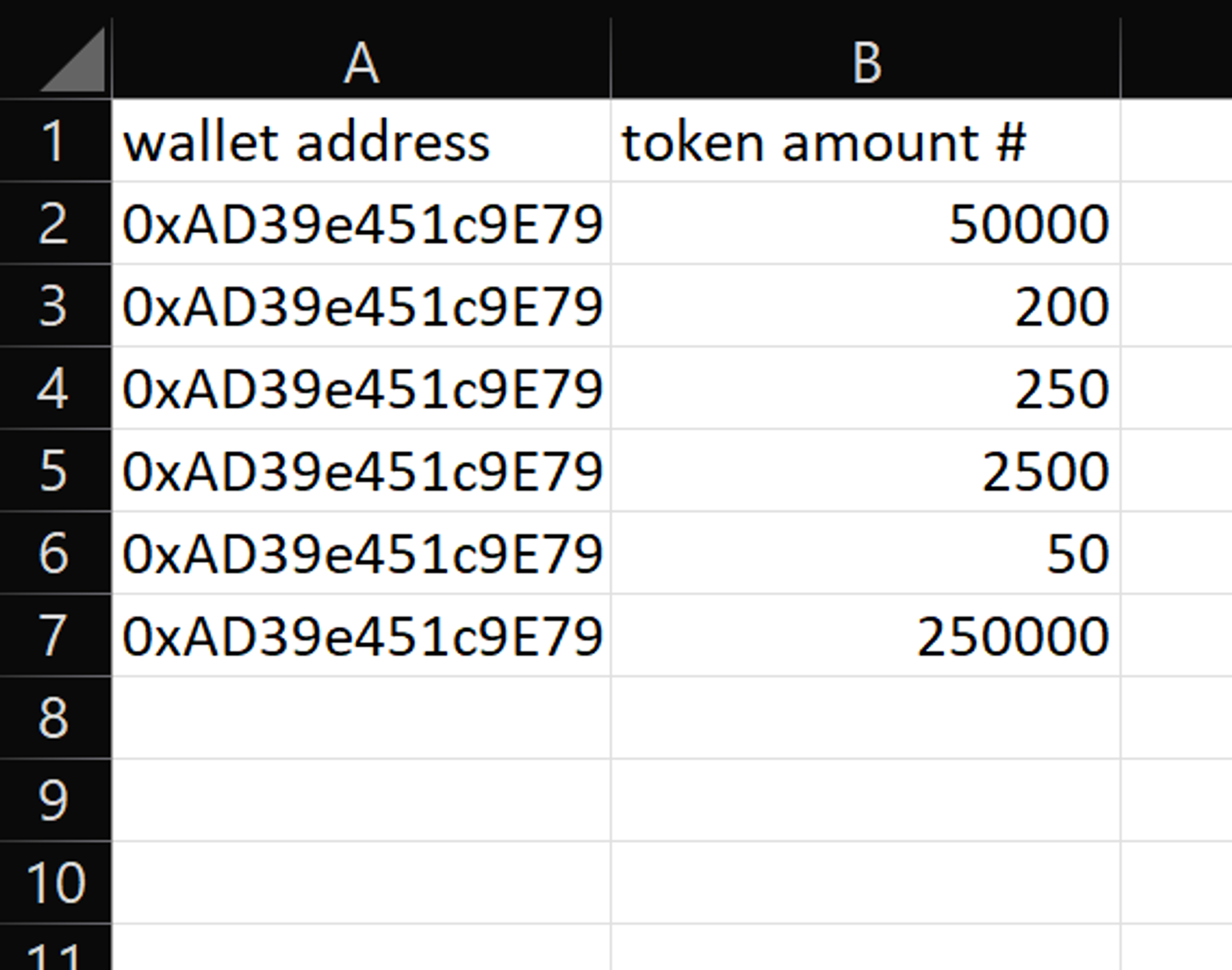 * Must be formatted *WALLET\_ADDRESS*, *AMOUNT\_TO\_AIRDROP*